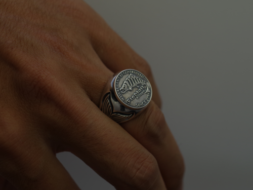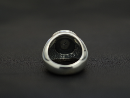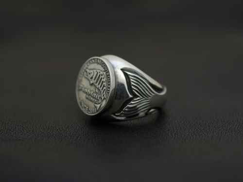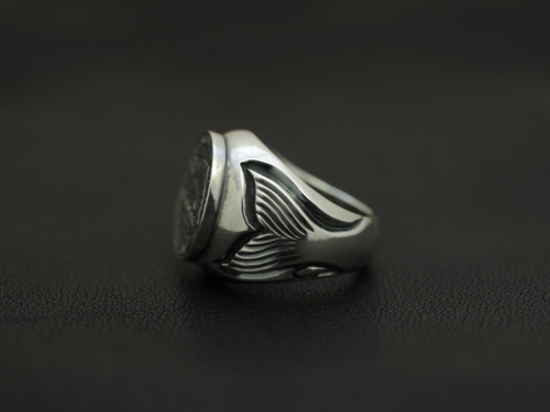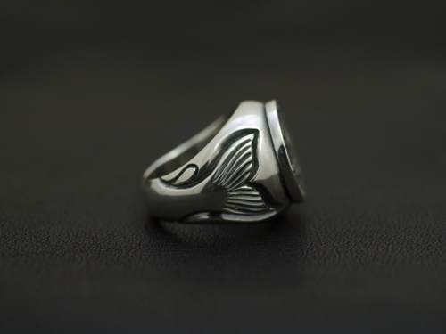 カレッジリングなど不変のデザインである印台型をベースに、トップにはオールドコインをイメージしたシンボルマーク、サイドには鱒の尾びれをモチーフにした模様を彫り込みました。アブラヒレがポイント。