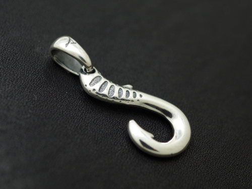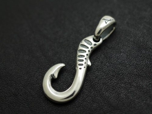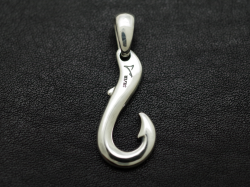 シルバーでは定番の釣り針モチーフをフィッシュテイル風にアレンジしたピンズ。シルバーの光沢を活かす柔らかい曲線が特徴。勿論パーマークとアブラビレは欠かせません。