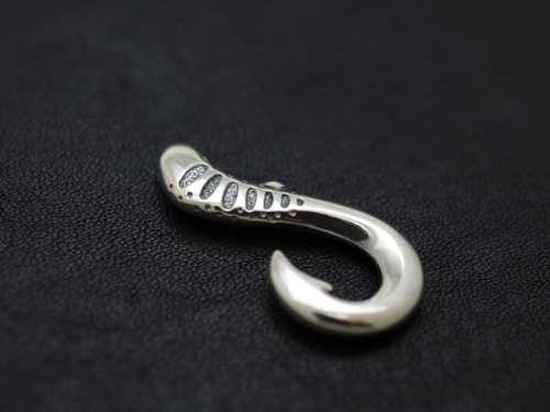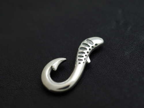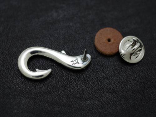 シルバーでは定番の釣り針モチーフをフィッシュテイル風にアレンジしたピンズ。シルバーの光沢を活かす柔らかい曲線が特徴。勿論パーマークとアブラビレは欠かせません。