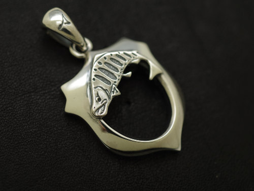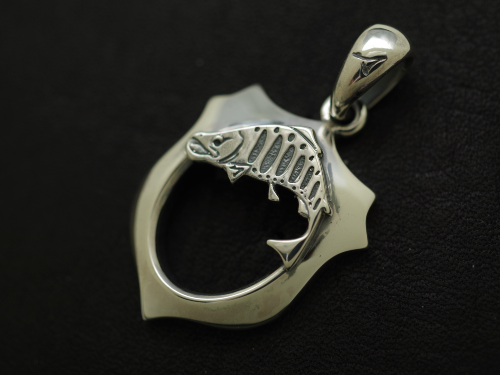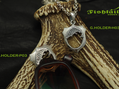 ちょっとメガネを外したい…。そんな時に掛けられる便利なグラスホルダー第三弾。 身を守る、勝利するという意味をこめたラッキーモチーフであるシールド(盾)をベースにヤマメをあしらいました。