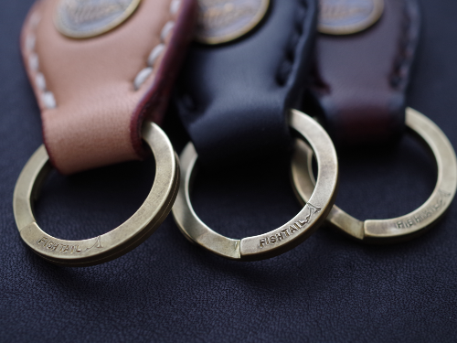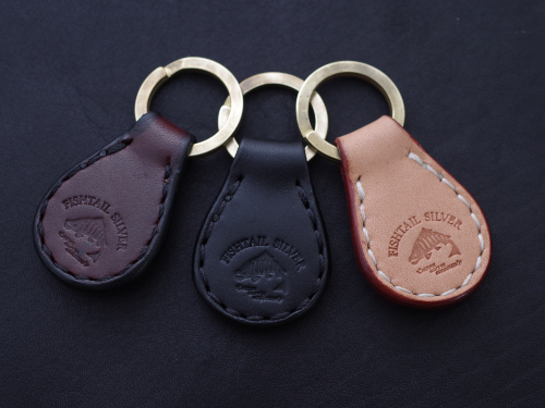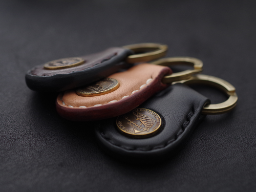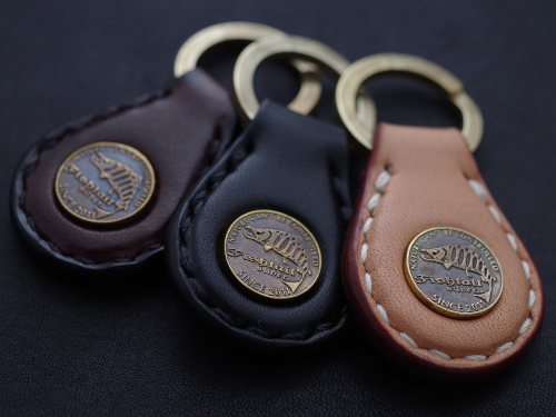 メインはオールドコインをイメージしたフィッシュテイルのシンボルマーク、素材は真鍮。レザーは手間を惜しまず立体感のあるデザインに仕上げており質感は抜群です。カラーはナチュラル、ブラック、ブラウンの三種類。