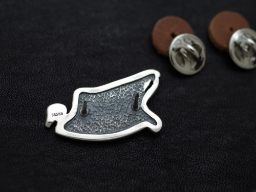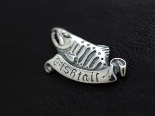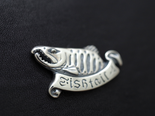 ヤマメをトラディショナルなデザインに格好良く仕立てたピンズ。この作品ではフィッシュテイルのロゴマークを表面に一点一点打刻しております。